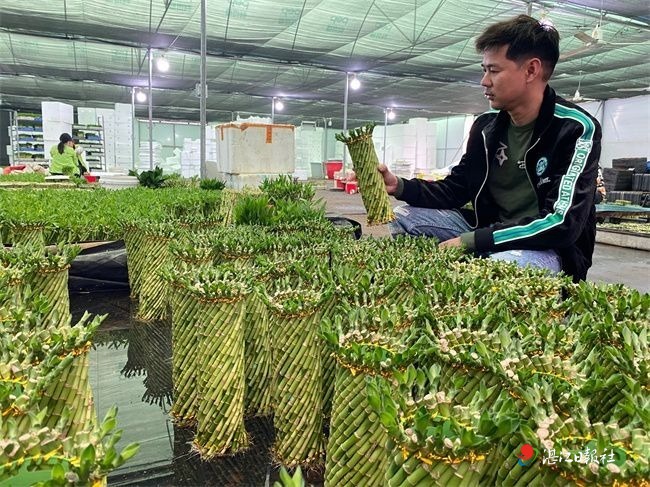 風水輪、一桶金、金字塔、大三塔、“菠蘿”……多種造型精美的富貴竹整齊裝箱啟運海內外。這是2023年12月31日,記者來到遂溪縣建新鎮黃宅村,走訪廣東廣恒園林有限公司看到的一幕。冬日暖陽下,企業加工廠內一派火熱的勞作景象:開料、扎料、包裝、搬運,工人們在各自崗位上緊張有序地忙碌。