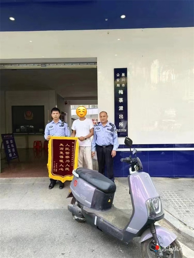 4月27日,吳川市一位市民制作了印有“人民警察為人民 失而復得暖人心”字樣的錦旗,贈送給吳川市公安局梅菉派出所民警,表達其感激之情。據悉,梅菉派出所近日抓獲一名涉案犯罪嫌疑人,為該名事主追回被盜電動車一輛。