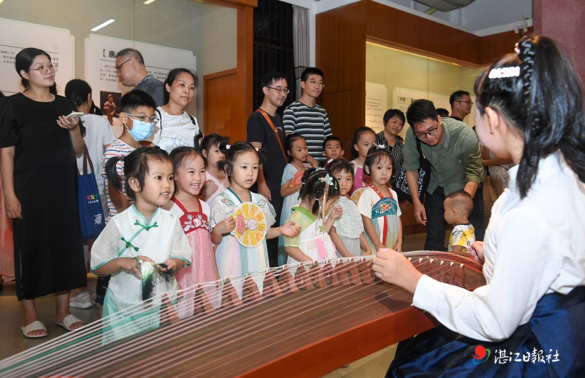 市民在講解員的帶領(lǐng)下在湛江非遺展廳參觀。7月9日晚,湛江市博物館首次開(kāi)放夜間游覽服務(wù)。非遺展廳內(nèi),市民在紅領(lǐng)巾講解員的引導(dǎo)下深入了解湛江非物質(zhì)文化遺產(chǎn)的故事;在陶瓷展廳,悠揚(yáng)的古箏仿佛把人們帶回了古代。觀眾們流連于展柜之間,尋找著國(guó)風(fēng)的魅力。當(dāng)晚還專門為孩子們舉辦了陶藝制作課程。據(jù)悉,湛江博物館的夜游首秀迎來(lái)了約300人參觀。