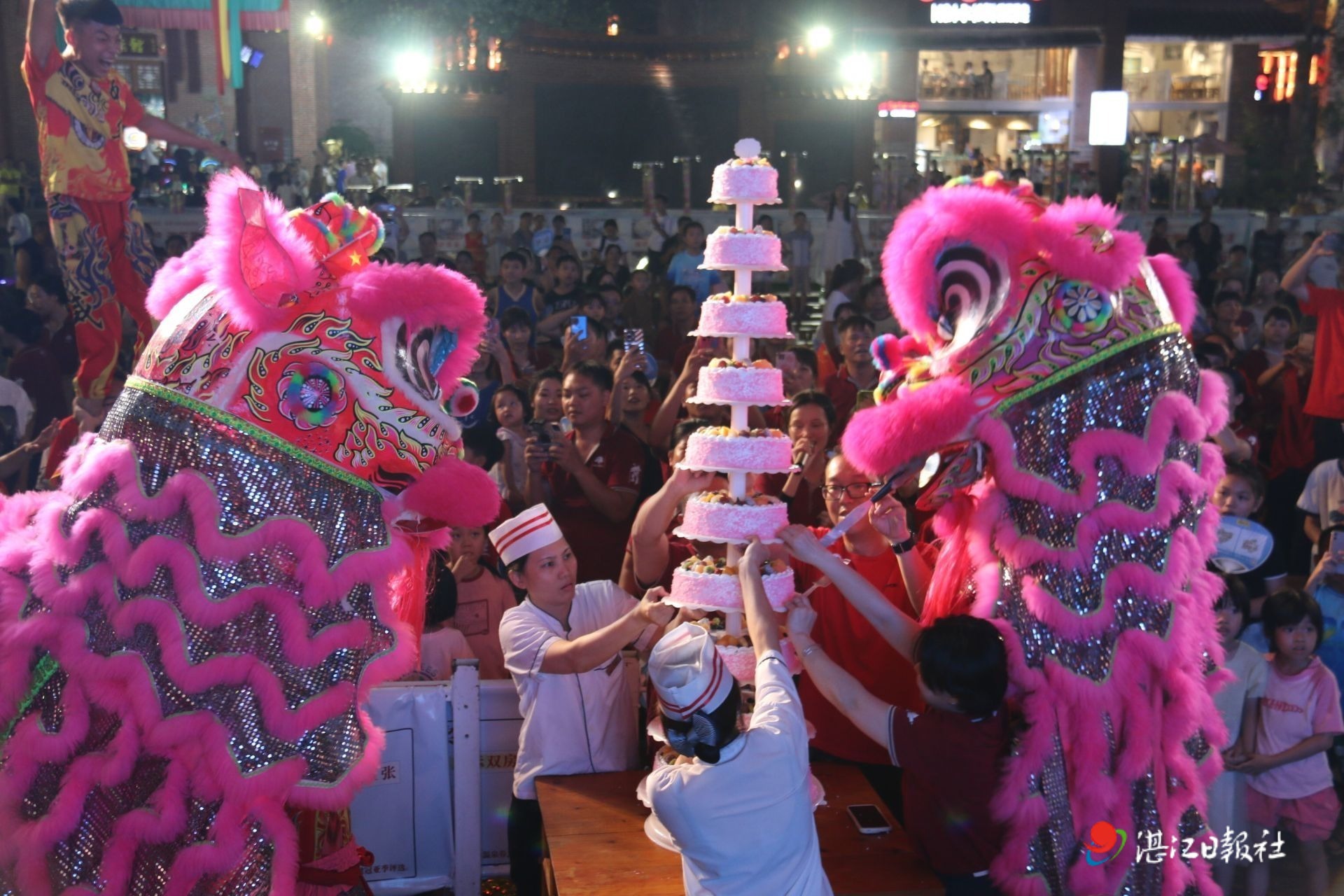 在茂德公鼓城的戲樓前,群眾敲起鑼鼓,舞醒獅并且準備十層蛋糕,慶祝全紅嬋奪冠。記者劉金鳳 攝