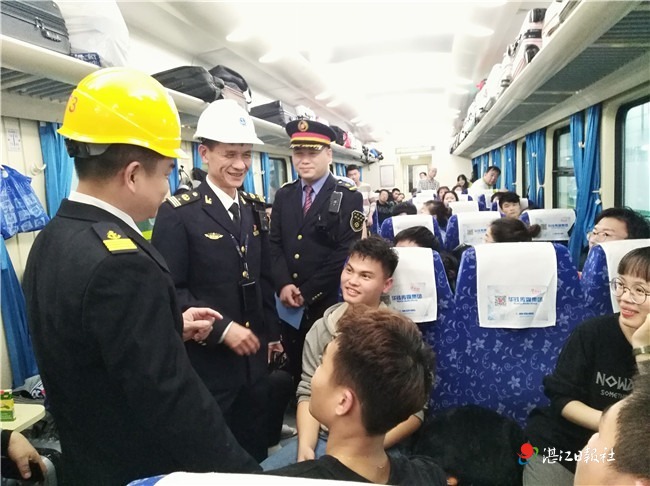 春節期間麥貳(左二)向火車輪渡旅客送祝福。 湛江海事局供圖