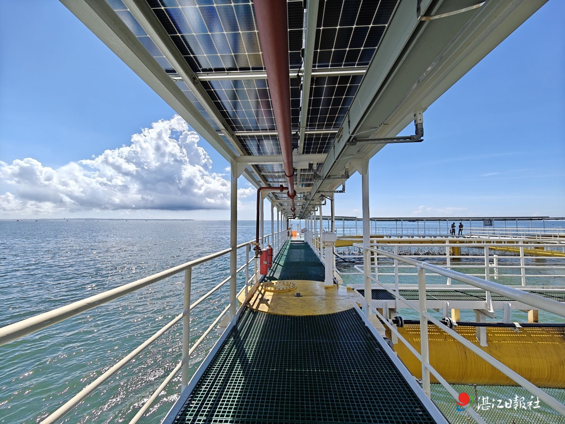 行走在“恒燚1號”的廊道上,記者發(fā)現(xiàn)猛烈的陽光都被“屋頂”擋住了,感覺陣陣陰涼。抬頭一看,這“屋頂”竟是一塊塊太陽能電池板構成的。這樣既能遮擋太陽,又能將太陽能循環(huán)利用,滿足平臺的日常供電需求,令人感嘆設計者的巧思。