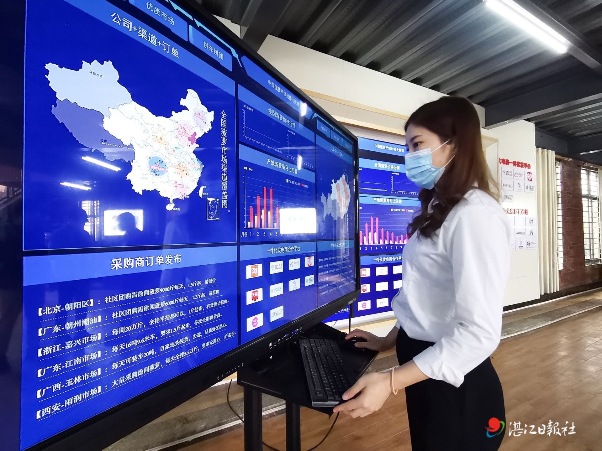位于徐聞的中國(guó)菠蘿電商產(chǎn)地直供基地,工作人員通過(guò)中國(guó)菠蘿產(chǎn)銷大數(shù)據(jù)平臺(tái)了解菠蘿市場(chǎng)行情。