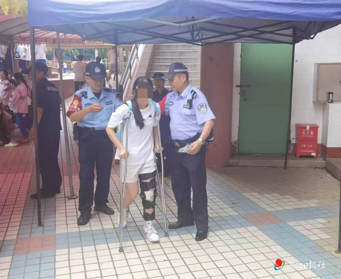 趕考路上的小意外,牽動著護考民警的心。6月7日7時40分,湛江市第二十中學初中部考點,一名考生在匆忙趕路時不慎劃傷了腿部,血珠滲出,疼痛讓他眉頭緊鎖,急忙向執勤點民警求助。
