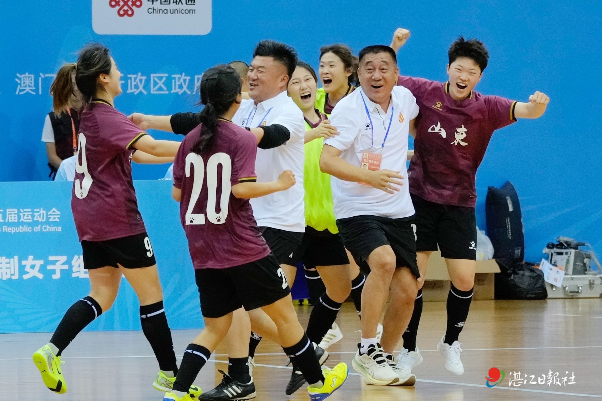 第十五屆全國運動會群眾比賽足球項目五人制足球女子組山東隊戰勝陜西隊后,隊員們教練們擁抱在一起慶祝。
