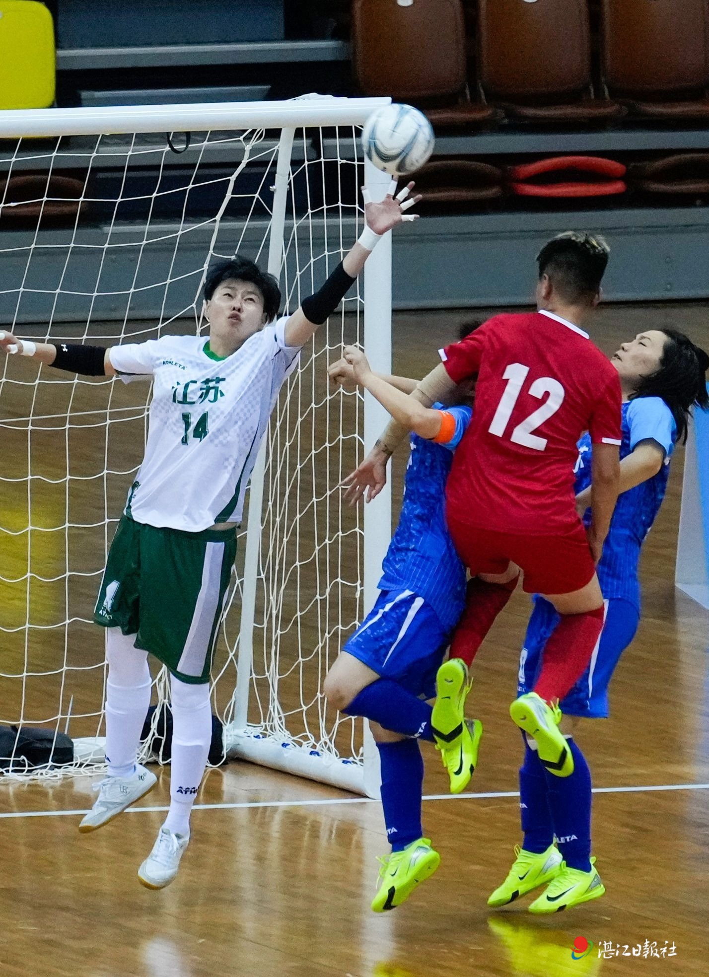第十五屆全國運動會群眾比賽足球項目五人制足球女子老將組江蘇隊對陣河北隊的比賽中,江蘇隊門將門前解圍。