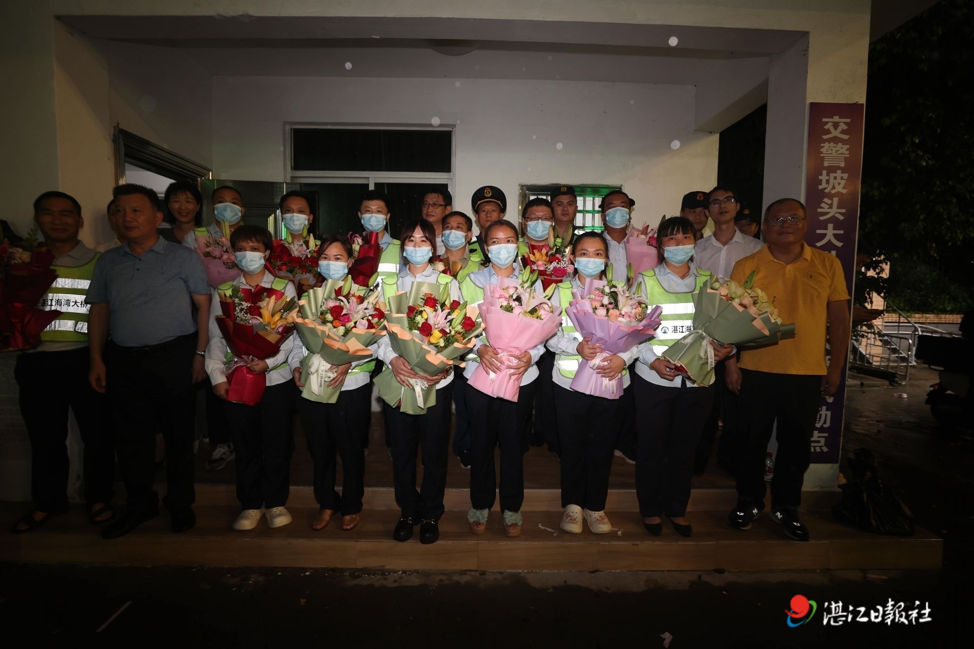 零時過后,12位堅守崗位到最后一刻的收費人員從崗亭走出“下班”,來到大橋一側執勤點接過公司贈送給他們的鮮花,作為一場特別的告別儀式。
