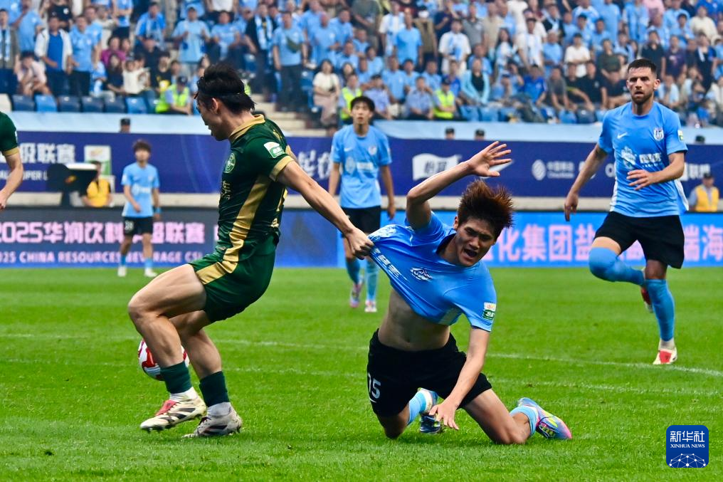 6月30日,大連英博海發隊球員劉祝潤(前右)在比賽中倒地。新華社記者 吳青昊 攝