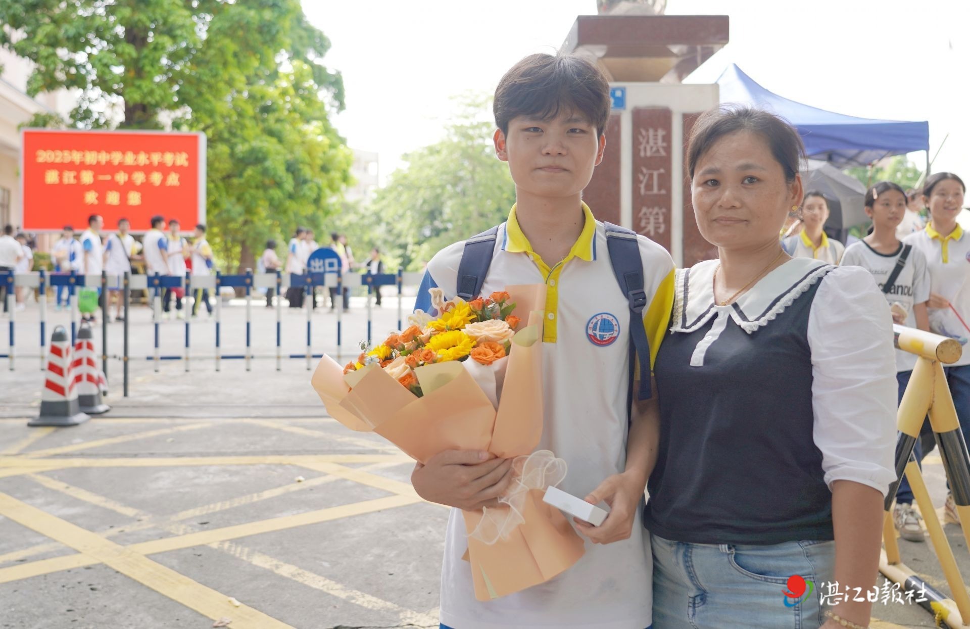 7月2日下午,2025中考湛江一中考點外,家長為考試結束的孩子送上鮮花并合影留念。