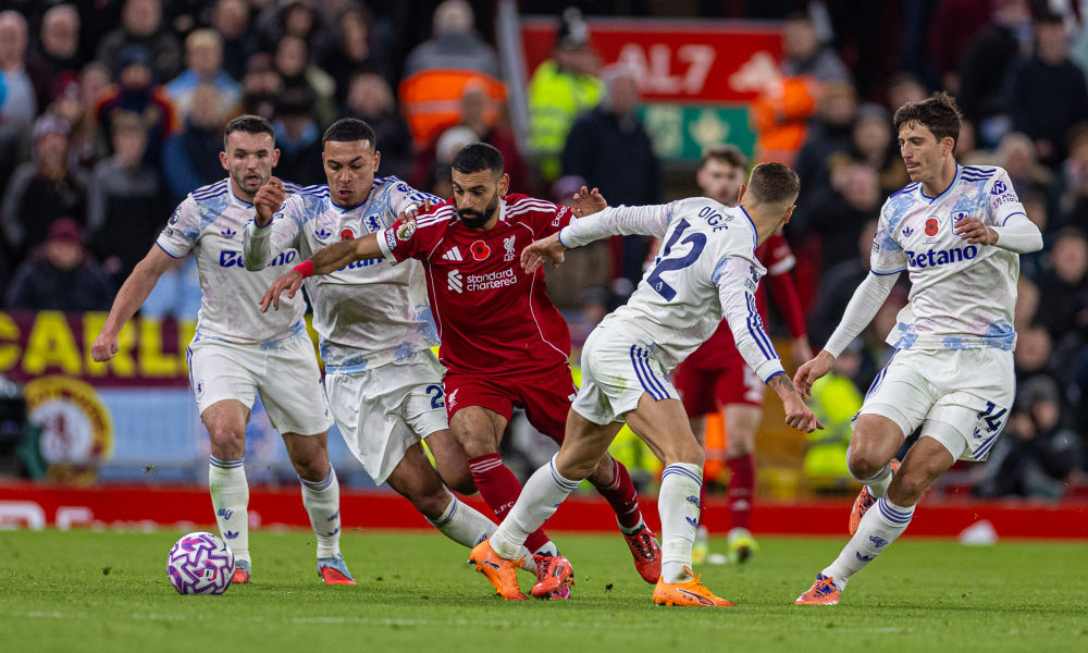 ??11月1日,利物浦隊球員薩拉赫(中)與阿斯頓維拉隊球員拼搶。新華社發