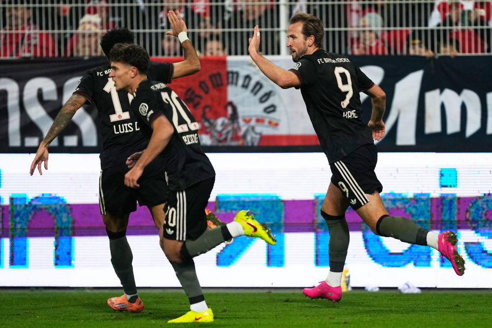 11月8日,拜仁慕尼黑隊球員凱恩(右一)慶祝得分。新華社/美聯