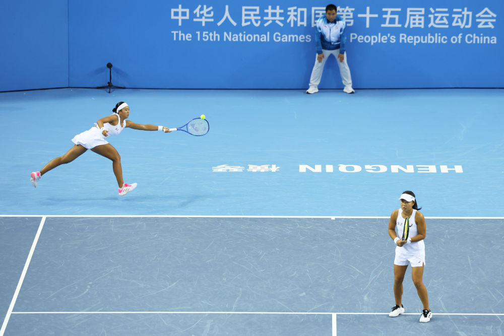 11月12日,北京隊組合張瑞恩(左)/任鈺菲在雙打比賽中。新華社記者 張晨霖 攝