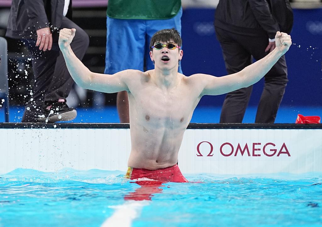 2024年7月31日,中國選手潘展樂在比賽后慶祝。當日,在巴黎奧運會游泳項目男子100米自由泳決賽中,中國選手潘展樂以46秒40的成績奪冠并打破世界紀錄。新華社記者 杜宇 攝