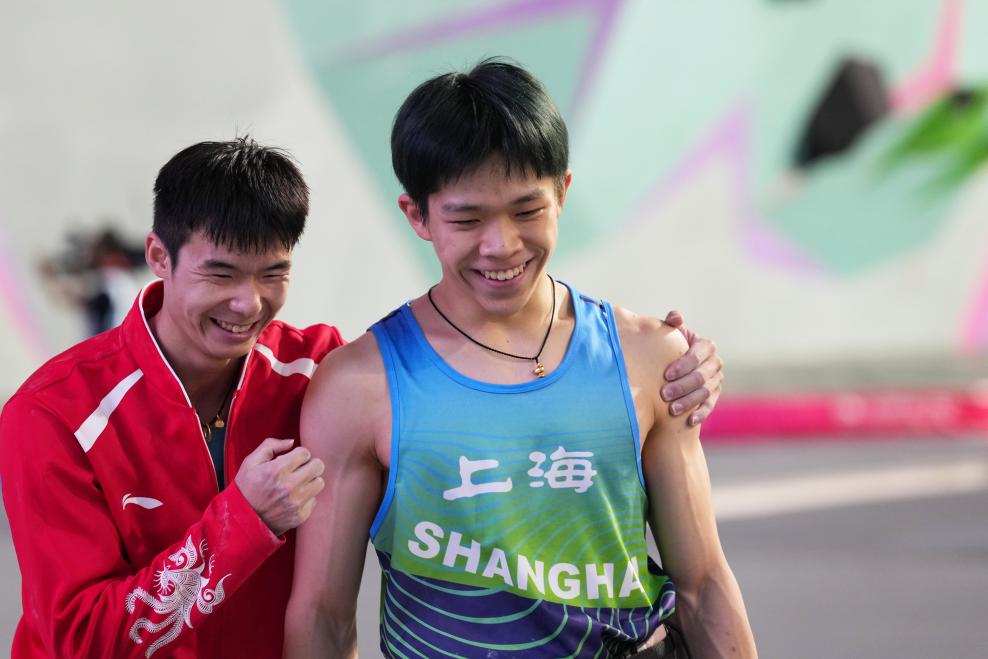 11月14日,上海隊選手趙一程(右)在男子速度金牌決賽奪冠后。新華社記者 賴向東 攝