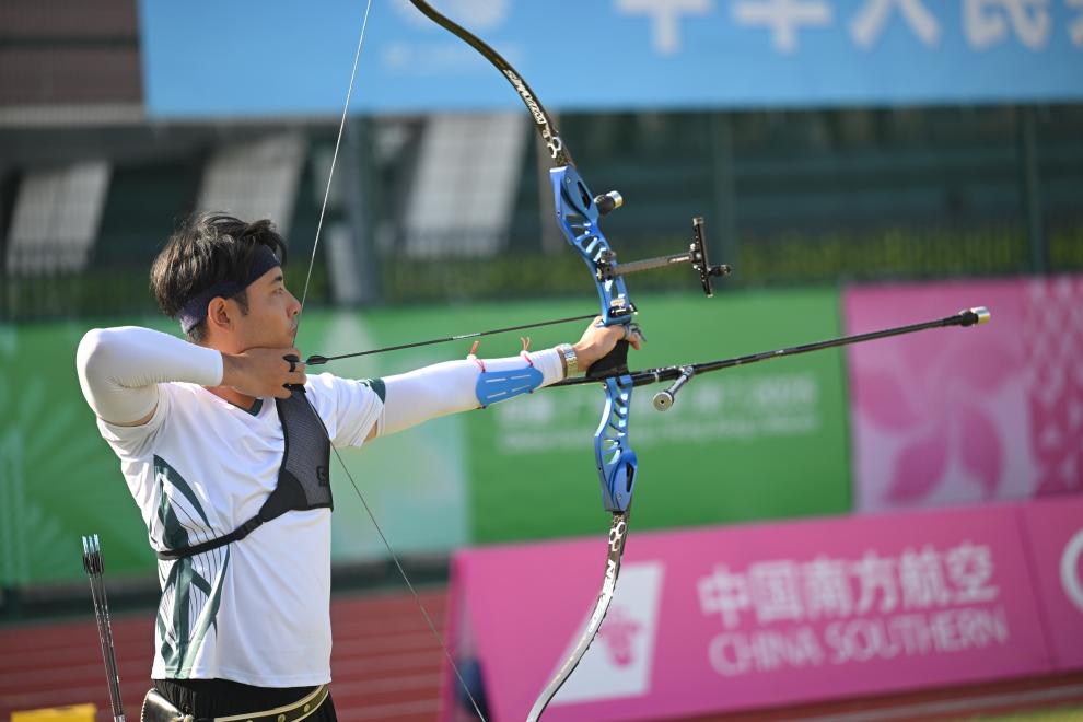 11月14日,澳門選手黎城杰在十五運會射箭項目男子反曲弓個人排名賽比賽中。新華社記者 張龍 攝