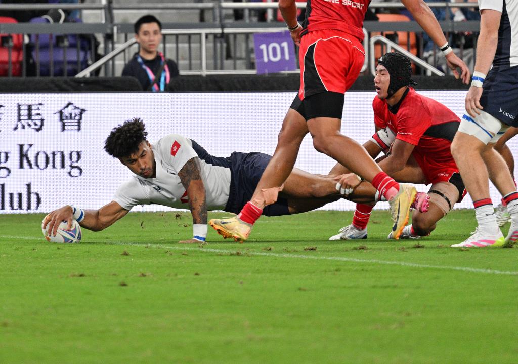 11月13日,香港隊球員丹馬克(左一)在比賽中進攻。當日,在香港舉行的第十五屆全國運動會7人制橄欖球男子小組循環賽中,香港隊43:5戰勝內蒙古隊。新華社記者 陳鐸 攝