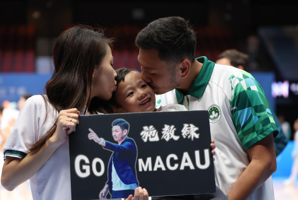 ??11月13日,澳門隊主教練施少雄(右)與妻子李恒茵(左)在賽后親吻孩子。新華社記者 孫凡越 攝