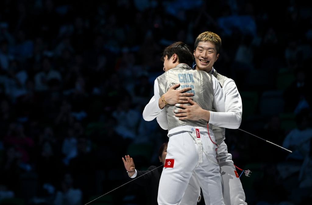 11月19日,香港隊選手張家朗(右)和隊友蔡俊彥在比賽后相擁慶祝奪冠。新華社記者 胡虎虎 攝